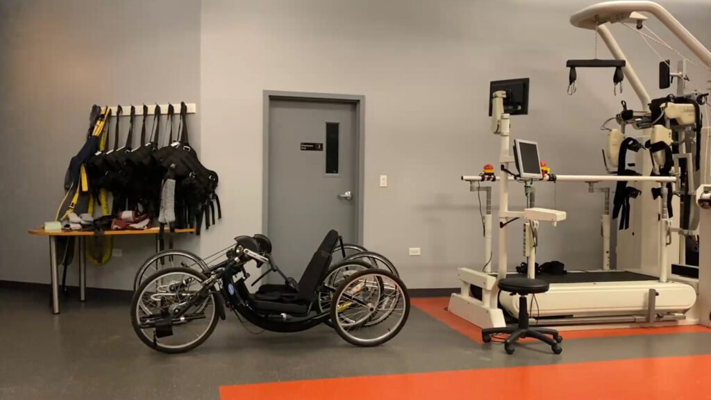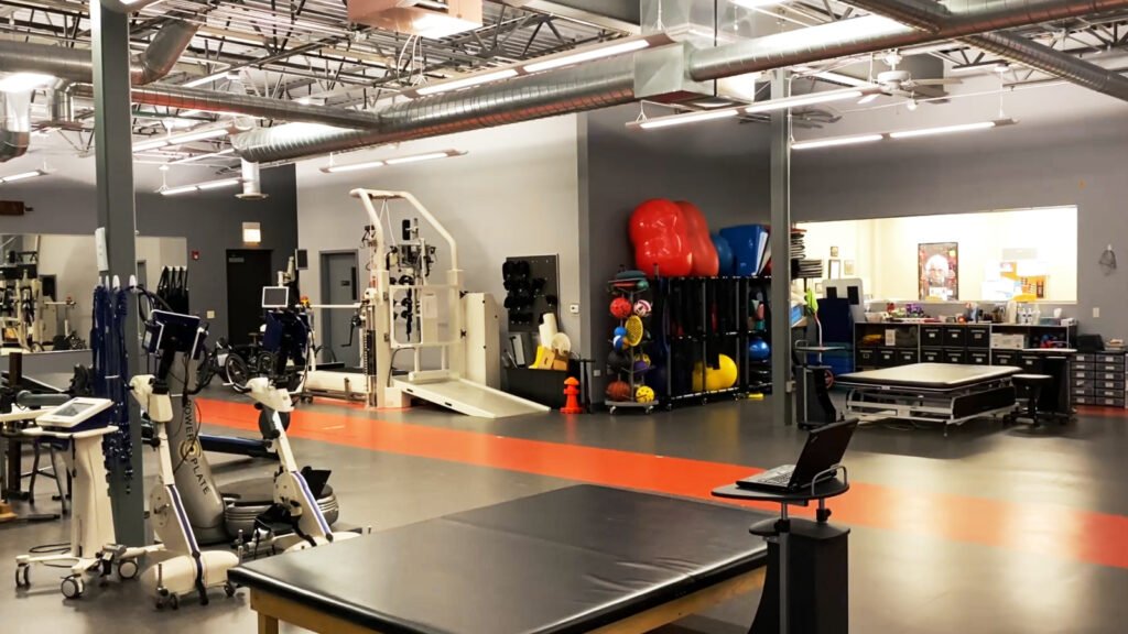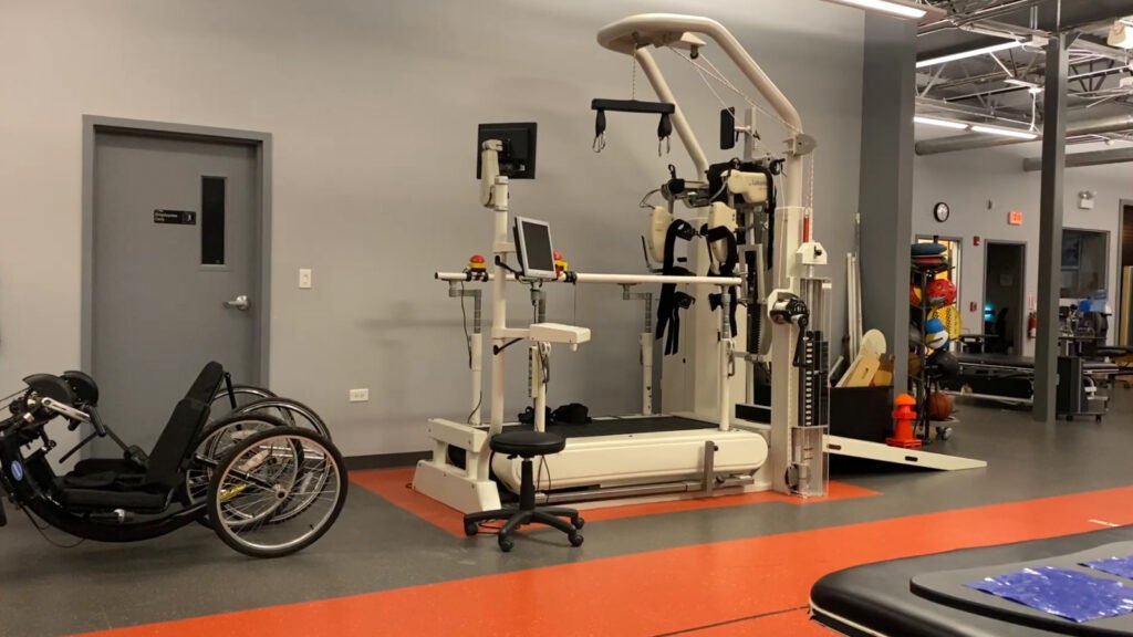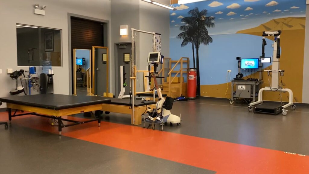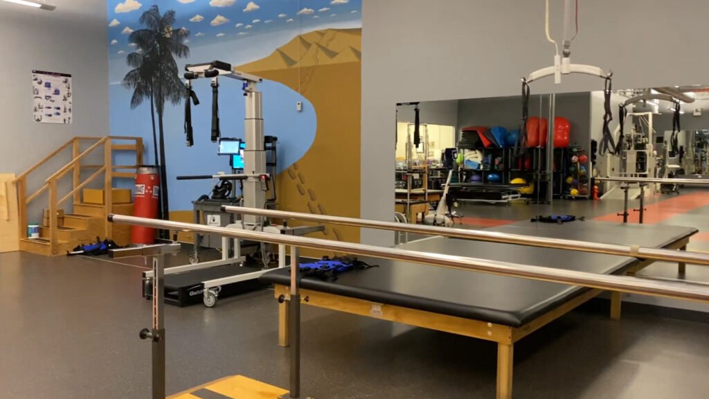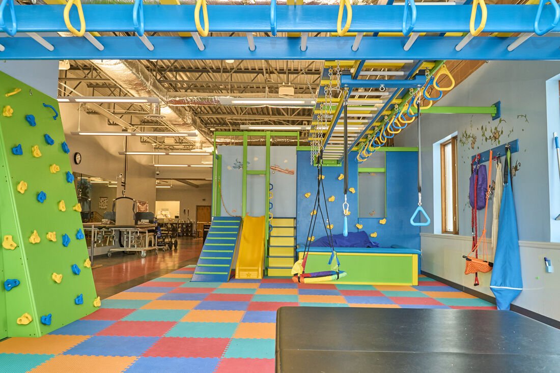 using body-weight support systems, adaptive equipment, and a purpose-designed play space to help